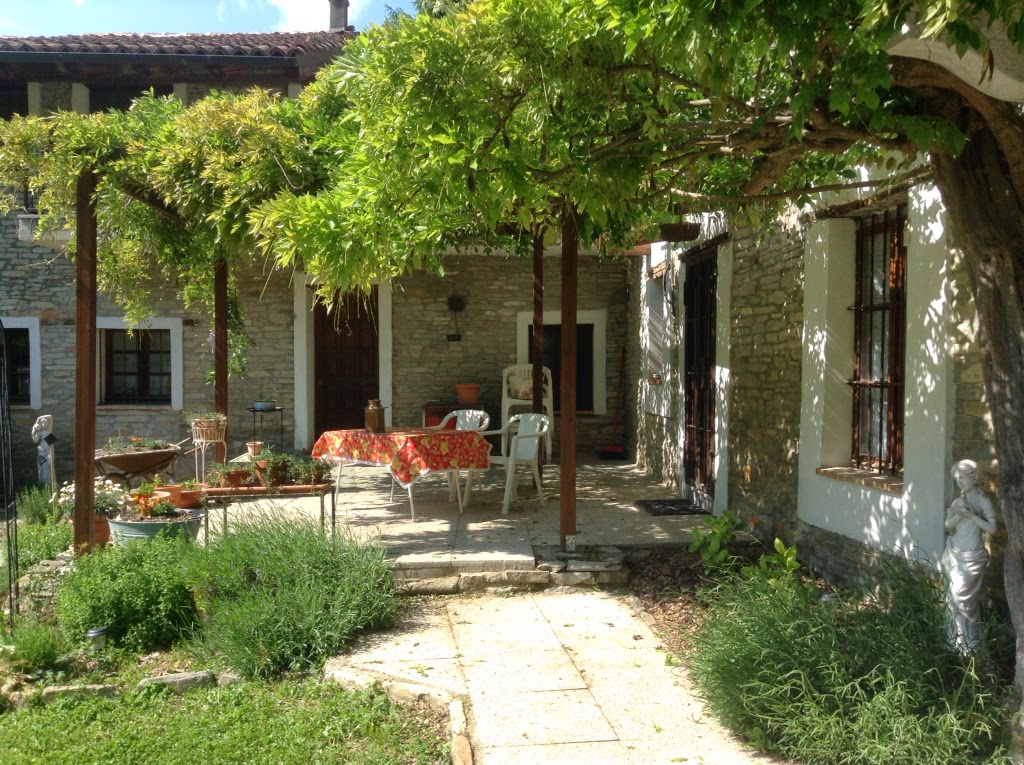 Where once there were flowers on the wisteria there are now leaves. They have given me the perfect excuse to pot some flowery plants and don the table with a brightly coloured tablecloth. The leaves are giving us a beautiful cool shade over the pergola for our breaks on sunny days. The much younger wisteria on the fienile isn't doing too bad either...